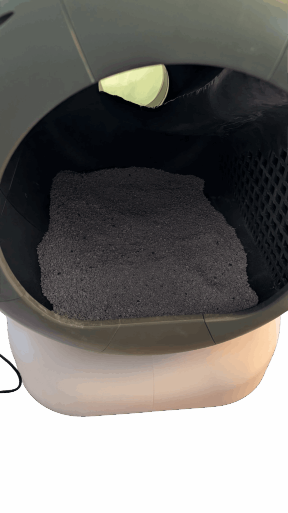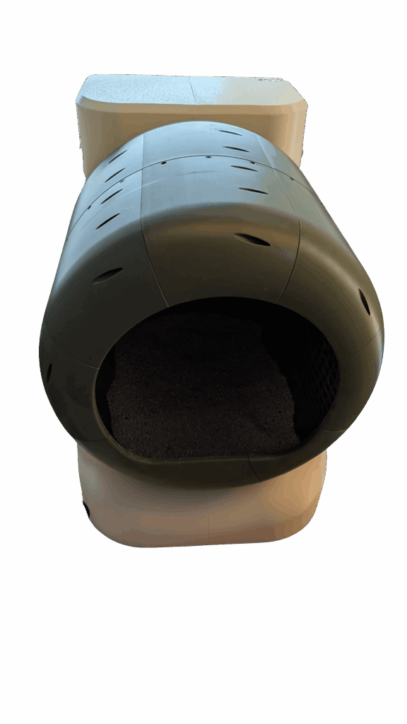 Die SmartCat Toilet ist ein automatisiertes Katzenklo mit rotierender Trommelmechanik. Nach der Nutzung erkennt das System, dass die Katze die Box verlassen hat, wartet kurz zur Sicherheit – und startet dann automatisch eine Reinigungsrotation. Dabei werden feste Rückstände in einen separaten hinteren Behälter befördert.